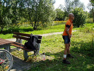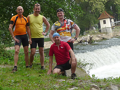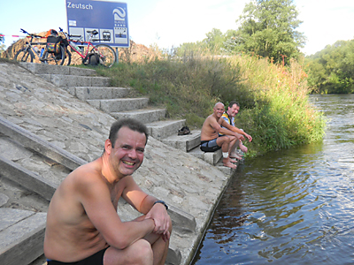 Am nächsten Tag verbrauchte ich in den ersten 90 Minuten 70% meiner Tagesenergie, denn es ging gleich zu Beginn 2x straff Bergauf – nach Paska und Reitzengeschwenda. Die Abfahrt zur Linkenmühle hätte fast mein Ende bedeutet, als sich der Befestigungsgurt meiner Tasche um die Hinterachse wickelte. Eine Vollbremsung verhinderte Schlimmeres. Hier angekommen nahmen wir im Hohenwartestausee ein erfrischendes Bad, denn die Sonne brutzelte erbarmungslos auf uns hernieder.