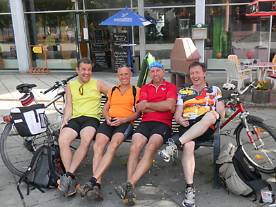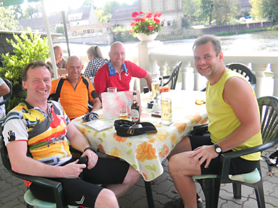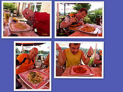 Beim Losfahren passierte dann das zweite Malheur – Jörg rutschte von der Pedale ab uns zog sich – nach seiner Ansicht – eine SPRUDELNDE Wunde zu, haha. Ich holte, in Form eines Druckverbandes, von einem parkenden Autofahrer erste Hilfe. Endlich war alles wieder chic – Jörg war verarztet und die Berge hatten ein Ende und so rollten wir zügig weiter den Saaleradweg entlang. Keiner hatte mehr Lust sich auch nur eine Burg aus der Nähe anzuschauen, denn diese liegen bekanntlich immer auf einem Berg. Auch Hunger macht bekanntlich böse – so auch bei Steffen. Nachdem ich alle an Saalfeld vorbei geschleust hatte -wo es teuflisch gute Thüringen Rostbratwürste gab – musste wir in Rudolstadt Zwangshalt machen um bei einem Italiener Kräfte zu tanken – Radler und Pasta.